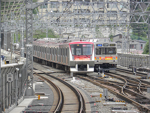 二子玉川から溝の口までは複々線区間だ。外側の2本の線路が田園都市線、内側の2本は大井町線。中間に二子新地、高津の2駅がある。しかしホームは外側だけ。大井町線の電車は中央の線路をスイスイと通過していく。ただし大井町線の電車には、わざわざ線路を切り替えてこの2駅に立ち寄る電車もあり、その風景は溝の口駅の渋谷寄りのホームから見物できる。ここからの眺めが楽しい。田園都市線は東京メトロ半蔵門線を経由して東武鉄道に乗り入れているから、ここを行き交う電車は種類が多い。大井町線には田園都市線や東横線で活躍した車両たちに混じって、最新型の6000系も走っている。このあたり、私の高校時代までは東急8500系しか走ってなかったけれど、いまや動く電車の展示会のようだ。