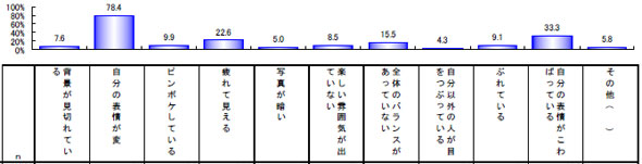 「自分が写っている写真で満足していない理由は何ですか?」と聞くと、トップは「自分の表情が変」で78.4%と断トツ。以下、「自分の表情がこわばっている」が33.3%、「疲れて見える」が22.6%、「全体のバランスが合っていない」が15.5%、「ピンボケしている」が9.9%で続いた。カメラ技術より、表情に問題があると考えている人が多いようだ。