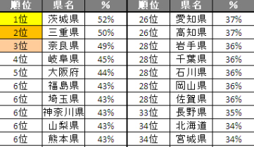 茨城県に次いで多かったのが「三重県」(50%)、そして「奈良県」(49%)という結果に。「『奈良の寝倒れ』(のんびりとした県民性などを意味する)という言葉があったように、今日でも夫の帰りがあまり遅くならないことも『帰宅を待っている』妻が多いことに影響している」(矢野所長)という。