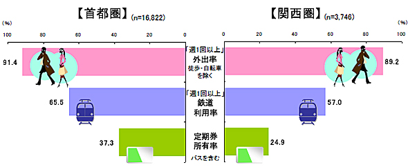 首都圏の人と関西圏の人、鉄道をよく利用しているのはどちらだろうか。「週1回以上」の鉄道利用率を調べたところ、首都圏66%に対し、関西圏は57%であることが、ジェイアール東日本企画の調査で分かった。また徒歩・自転車を除く「週1回以上」の外出率を見ると、関西圏(89%)に比べやや首都圏(91%)が多いという結果に。