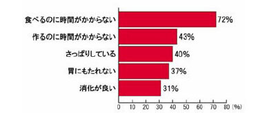 「朝食に求めるもの」を聞くと、最も多かったのは「食べるのに時間がかからない」で72%。以下、「作るのに時間がかからない」が43%、「さっぱりしている」が40%、「胃にもたれない」が37%で続いた。