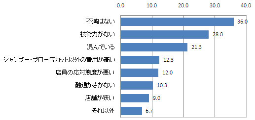 あなたはカット代1500円以下の理髪店に対し、不満点はありますか? 最近1年以内にカット代1500円以下の理髪店を利用したことがある人に聞いたところ「不満はない」と答えた人が最も多く36.0%、次いで「技術力がない」(28.0%)、「混んでいる」(21.3%)、「シャンプー・ブローなどカット以外の費用が高い」(12.3%)、「店員の応対態度が悪い」(12.0%)であることが、マーシュの調査で分かった。