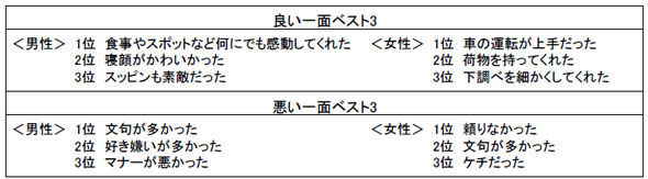 逆に相手の悪い一面も聞いたところ、男性は「文句が多かった」「好き嫌いが多かった」「マナーが悪かった」を挙げる人が多かった。女性は「頼りなかった」と答えた人が最も多く、以下「文句が多かった」「ケチだった」という結果に。