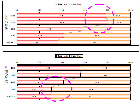 家族やパートナー(恋人)以外の異性と接する際、あなたが「密接距離(15〜45センチ)」になることを許せるのはどの年代ですか? この質問に対し、約8割の男性が20〜30代の女性は「(密接距離は)許容できる」と回答。その一方で、女性が男性に対して「密接距離」を許せるのはどの世代でも低く、特に半数以上の女性は40代以上の男性が「密接距離」まで近づくことは許容できないと答えた。