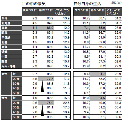 エリア別にみても、全地域において8割以上の人が「悪かった」と回答。最も評価が低かったのは東北で、「良かった」は1.2%、「悪かった」は86.9%。「震災の被災地でもあり、産業や就労など地域経済への震災の影響の大きさや、原発事故と風評被害などが景気評価が最低となった原因だろう」(博報堂生活総合研究所)と見ている。