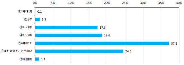 1つの会社で最低何年働こうと考えていますかと聞いたところ「6年以上」(37.2%)がトップ。以下「まだ考えたことがない」(24.5%)、「4〜5年」(18.6%)、「2〜3年」(17.3%)と続いた。