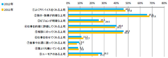 あなたにとって理想の上司は? この質問に対し「指示・指導が明確」(65.8%)と答えた人が最も多かった。次いで「よくアドバイスをくれる」「相談にのってくれる」(いずれも46.2%)、「仕事を的確に評価してくれる」(40.4%)という結果に。6位にランクインした「ビジョンが明確」(25.5%)は昨年と比べ4.0ポイントの減少。一方、5位の「ユーモアのある」(28.2%)は同3.1ポイント増加した。