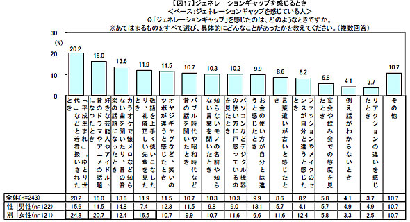 ジェネレーションギャップを感じている人に、どのようなときにそう感じるかを聞いたところ「平成生まれ、ゆとり世代など若者扱いされたとき」(20.2%)を挙げる人が最も多かった。このほか「好きな芸能人やアイドル、昔のドラマやアニメの話題になったとき」(16.0%)、「カラオケで懐メロなど知らない曲を聞いたり、昔の音楽の話題になったとき」(13.6%)、「敬語をうまく使いこなしたり、礼儀正しい先輩を見たとき」(11.9%)と続いた。