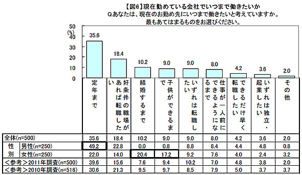 現在の勤務先に、いつまで働きたいですか? この質問に対し「定年まで」(35.6%)と答えた人が最も多く、次いで「好条件の職場があれば転職したい」(18.4%)、「結婚するまで」(10.2%)、「子どもができるまで」(9.0%)と続いた。