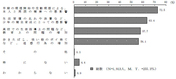 一方、デメリットも聞いたところ「早期の喫煙開始や受動喫煙による、本人と周囲の健康への悪影響」(72.5%)と答えた人がトップ。次いで「生活習慣の乱れや浪費など、少年の健全育成にとっての悪影響」(63.4%)を挙げる人が目立った。