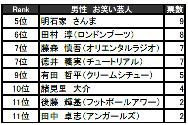 2位にはオアシズの「光浦靖子」さん(24人)、以下「友近」さん(18人)、「久本雅美」さん(10人)という結果に。光浦さんについては「モテない女性の代名詞になっているが、お似合いの男性がいることを実証したい」などのコメントがあった。
