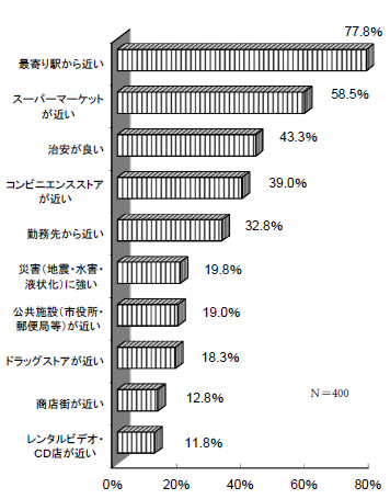 今後の住まい探しで重視する環境(立地)についても聞いたところ「最寄り駅から近い」(77.8%)と答えた人が最も多かった。次いで「スーパーマーケットが近い」(58.5%)、「治安が良い」(43.3%)、「コンビニエンスストアが近い」(39.0%)と続いた。