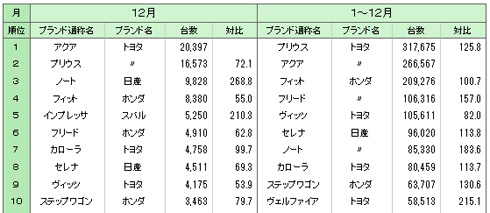 この結果、2012年トータルでの販売台数を見ると、トップは4年連続で「プリウス」で31万7675台となった。2位は「アクア」で26万6567台、3位はダイハツの軽自動車「ミラ」で12万14台、4位は「N BOX」で21万1156台、5位はホンダの「フィット」で20万9276台だった。