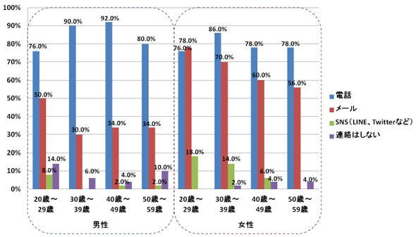 遅刻するとき、その連絡はどのように行っているのだろうか。すべての年代において「電話」が7割を超えた。特に男性の30〜40代では9割以上の人が「電話」と回答している。「メール」については男性よりも女性のほうが多く、20代女性では唯一「メール」が「電話」を上回った。また「SNS」と答えたのは、男女ともに20代が最も多い。