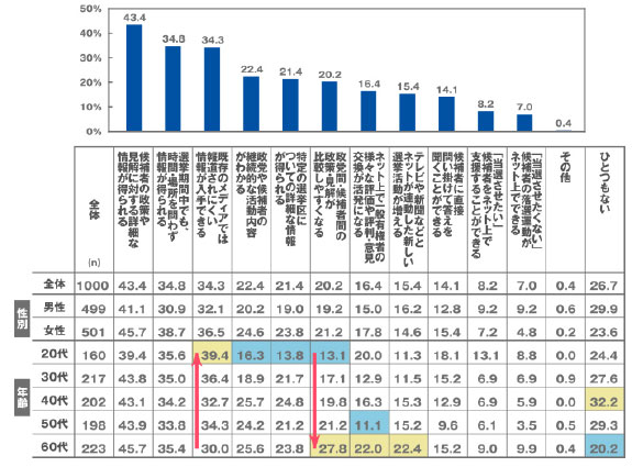 年代別にみると、年代の高い人ほど「詳細な情報が得られる」「政策・見解が比較しやすくなる」などの側面を評価する一方、若い人は「既存メディアでは報道されにくい情報が入手できる」「候補者に直接問いかけて、答えを聞くことができる」などを評価している。「ネット選挙の解禁はいままで以上にリッチな政策情報が得られる側面だけにとどまらず、党首や立候補者との直接対話や、SNSなどを通じた党首や立候補者の人物理解の機会が拡大すると思われる」(マクロミル)