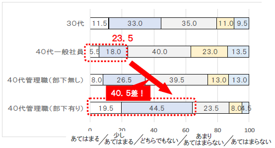今後、昇進の可能性があると感じている人はどのくらいいるのだろうか。「昇進の可能性を感じている」と答えた40代管理職(部下あり)は64.0%、40代管理職(部下なし)は34.5%に対し、40代一般社員は23.5%にとどまった。