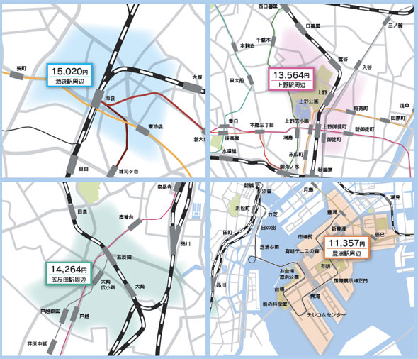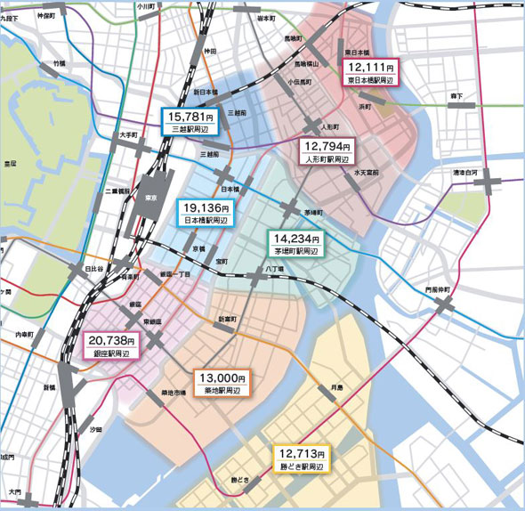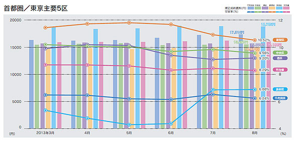 以下、東京の他のエリアの推定成約賃料を示す。調査期間はいずれも、2013年8月1〜31日。以下のコメントはすべて「オフィス通信リーシングレポート」によるもので、当月は8月、前月は7月を示す。