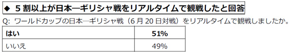 「観戦した」という人のうち、74%が自宅で観戦しており、13%は休暇を取得して代表チームを応援したという。また、6月25日のコロンビア戦についても、54%が「観戦する予定」と回答。「ギリシャ戦は通勤・通学時間帯の放送となり、関東地方の視聴率は33%で歴代ワースト3位だった。それにも関らず、平均年収が1000万円を超えるビジネスパーソンの視聴率が51%と高かったのは、ビジネスプロフェッショナルは裁量範囲も広く、フレキシブルに仕事に臨めているからではないか」(ビズリーチ)としている。