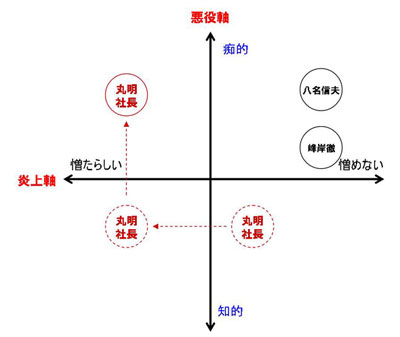 タテ軸は役者の「悪役軸」。事件などで「悪に仕立てられた」が元は善玉な人は上へ、“元来悪いヤツ”は下に位置付けられる。ヨコ軸は世間の「炎上軸」である。左は“憎たらしい”、右は“憎めない”。右上は好“漢”度が高く、左下は悪“漢”度が高い。