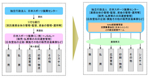 2005年シーズンまでは大和銀行に業務を委託した後、大和銀行がJSAL(日本スポーツ振興くじ)に再委託、そしてさらに日本スポーツ振興くじが各分野の業者に再々委託をするという方式になっていた。改革後は日本スポーツ振興センターが競争入札を行い、各分野の業者に直接発注する方式に変更したことや、くじの販売システムを見直したことによって、経費を大幅に削減することに成功し、「損益分岐点を大きく下げることができた」(森田氏)という。