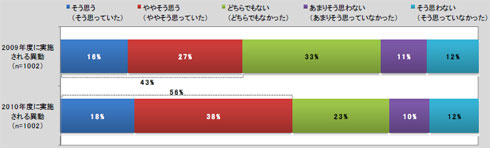 「そう思う」と答えた人にその理由を聞くと、「会社の方針だから」「サラリーマンだから」という理由が多かったが、「不況と言われる現在、雇用の維持だけでもと考えてしまう」、「景気悪化で退職者より新規雇用者が少なく、人員不足の部署にまわされても仕方ないと思うから」と約1割は不況を理由に挙げていた。