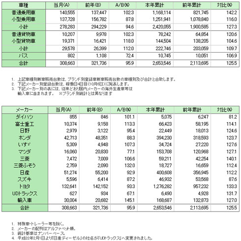 エコカー減税終了の影響もあり、9月の新車販売台数は前年同月比4.1%減の30万8663台。前年同月比では2009年7月以来、14カ月ぶりにマイナスに転じた。メーカー別に見ると、トヨタが前年同月比6.7%減、ホンダが同11.7%減、日産が同7.1%減、マツダが同22.9%減と各社とも不調だった一方、輸入車は同45.1%増と好調だった。