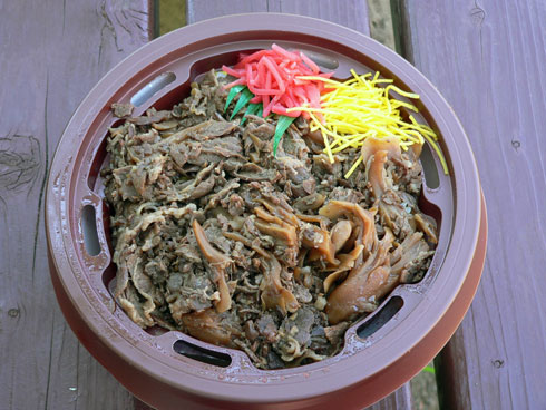 私はアクアパークに戻り、傍らの広場のベンチで駅弁を開けた。「牛肉まいたけ釜めし もぉ〜舞っちゃう」という楽しいパッケージだ。買う時は気づかなかったけど、加熱機能が付いている。温めたほうが旨かろうとひもを引っ張ると、炊きたてのように熱くなる。汗を拭きつつ、暑い中で熱い釜めし弁当を食べる。もうフラフラである。食べ終わり、涼を求め再び歩き、公園のそばにある公民館に入った。1階は児童館のようで子どもが遊んでいる。それを見守る母親たち。なんか場違いなところに来ちゃったな、と思いながら冷房を浴び、自販機で冷たいお茶を買う。