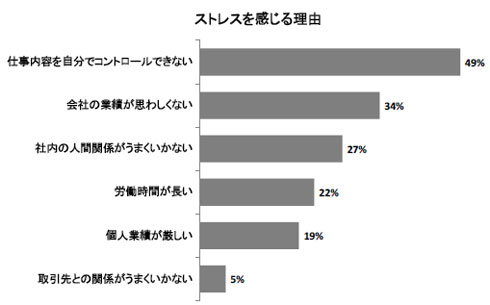 なぜあなたはストレスを感じているのですか? 「ストレスを感じている」と答えた人に、その理由を聞いたところ「仕事内容を自分でコントロールできないから」(49%)と答えた人が最も多かった。次いで「会社の業績が思わしくない」(34%)、「社内の人間関係がうまくいかない」(27%)、「労働時間が長い」(22%)、「個人業績が厳しい」(19%)、「取引先との関係がうまくいかない」(5%)という結果に。