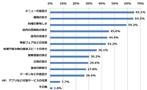 またファミレスに求めることを尋ねると、「メニューの豊富さ」(65.1%)がトップ。以下「価格の安さ」(64.5%)、「料理のおいしさ」(59.2%)と続いた。