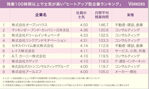残業100時間以上で士気の高い企業ランキングをみると、1位は仲介事業などを手掛ける「オープンハウス」(月間平均残業146.7時間)。「評価制度は売り上げと直結している。かなり公正に結果が評価されている」(男性)といった声があった。2位には「マッキンゼー・アンド・カンパニー日本支社」(120.8時間、コンサルティング)、以下「ドリームインキュベータ」(132.5時間、コンサルティング)「リンクアンドモチベーション」(103.3時間、コンサルティング)と続いた。