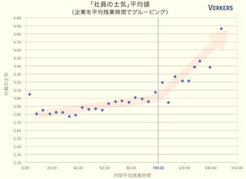 残業100時間までは「士気の高さ」が緩やかに上昇しているが、100時間を境に急上昇。「月間100時間以上の残業が求められる環境では、より高い士気が必要とされる傾向があるのかしれない。もしくは士気が高いがゆえに、残業時間が100時間を超えているのかもしれない」(ヴォーカーズ)