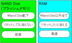 具体的にはフラッシュメモリ領域は,\Nand Disk配下のフォルダであり,それ以外のフォルダは全てRAMに配置されている。