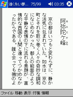 ![]() BOOK,TXT,HTMLに対応した電子ブックビューワ。インターネットから電子ブックのデータを入手して,文庫本を読む感覚で読書できる。有料の電子ブックは「PDABOOK.JP」や「e文庫」から購入できる。