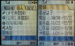 システム手帳としてのケータイA1011STはアドレス帳機能やスケジュール機能も充実している。それは,女性に人気のあった旧機種C411STの流れを引き継ぎ,さらに女性好みの方向に進化を遂げているように感じられた。 たとえば,アドレス帳機能には通常の電話番号や住所に加えて,誕生日や血液型,星座,趣味を登録する項目が新しくできた。若い女性向けのシステム手帳には,このようなデータを記入する欄がついていたりするものだが,携帯の機能にまで登場したのには少々驚かされた。 誕生日を入力すると,自動的に星座も選択される仕組み。なんとさらに星座の表示法は12星座か13星座の2種類が選べるのだ。そもそも,蛇遣座の存在を知っている人がどれくらいいるのだろう? こんな遊びの部分にも細かくこだわる姿勢には脱帽だ