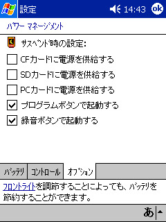 ![]() フロントライトの調整は消灯も含めると10段階。バッテリーとAC駆動時で個別に設定が可能。フロントライト/バックライトを最も暗くした状態でのiPAQ Pocket PCとの違いはかなり大きい なおフロントライトの点灯、消灯は電源スイッチの長押しで任意に行えるが、iPAQ Pocket PCのように明るさを検知して自動制御する機能は持たない。GENIO e550Gではバッテリー残量が70%以下になると自動的にフロントライトの明るさを制御し、バッテリー残量が10%を切ると自動的にフロントライトを消灯するなど、iPAQ Pocket PCとは違ったアプローチでバッテリー駆動時間に配慮している。