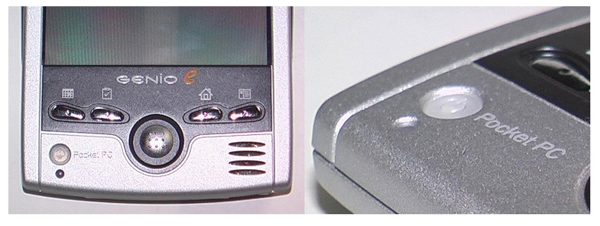 GENIO e550Gの各レイアウトはPocket PCのほぼスタンダードといえるものだ。前面は下部に集中して4つのプログラムボタンと4方向キー、電源スイッチにスピーカー、左側面に録音キー(プログラムボタン5)、赤外線ポート、マイクを備える。CF Type IIスロット、SDスロット、イヤホンジャックは上面だ。スタイラス収納部には特にギミックはない。 なおPocket GearやカシオペアE2000、今後発売予定のPocket LOOXに見られる側面のジョグダイヤルのような機能はなく、プログラムボタンもPocket LOOXのようにほかのキーを併用して複数機能を割り当てるといった機能は備えていない。