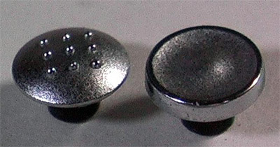 ![]() このように前面の4つのプログラムボタン、録音ボタン(プログラムボタン5)の操作で電源をONにする機能は無効にできる 決定キーを兼ねる4方向キーはコンパクトなスティックタイプ。つまり上下左右を押すのではなく上下左右に倒すタイプで、倒したまま360度回転させることもでき、8方向に反応する。使い勝手は悪くないが、4方向キーだけを長時間操作していると指が痛くなることも。 プログラムキーも含め、4方向キーの操作でつい指先に力が入ってしまいそうなアクションゲームには向かない感じだ。 なお4方向キーは標準で凸形状に滑り止めとして小さな9つの突起が付いたものと、凹形状で中央部が盛り上がったものが付属し、好みや用途に合わせて交換できる。