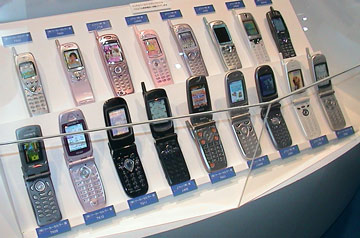 携帯にも“インテル、入ってる”?WIRELESS JAPANのインテルブースでは、インテル製メモリやベースバンドチップを搭載した携帯電話が並んでいる
