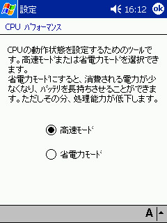 ![]() CPUの動作クロックは2段階の設定が可能。動画再生以外なら省電力モード(200MHz)で十分だ パフォーマンスはGENIO e550Gと同じような印象だ。高速モードと省電力モードがあるが、PIMやアプリケーションを使っている限りでは、両者の違いをほとんど感じない。例えば地図ソフト「モバイルアトラス」でスクロール速度を比較してみたが、差はほとんどなかった。 高速モードが必要になるのは、動画再生の場合だ。テスト用にWindows Media Encoder 7を使い、PDA向けとされる150Kbps、250Kbpsの2つのプロファイルで動画ファイルを作成。これをPocket LOOXで再生してみた。結果から言うと、150Kbpsならば、高速/省電力のどちらのモードでも問題なく再生できたが、250Kbpsのほうは400MHzでないと、まともに再生できなかった。200MHzでは紙芝居のようになってしまうのだ。 もっとも、この結果からPXA250の400MHz動作をパワフルと呼んでいいかというと、これにはちょっと疑問が残る。同じ250Kbpsの動画を、筆者のiPAQ Pocket PC(StrongARM/206MHz)でも問題なく再生できてしまうからだ。 両モードの違いをより詳しく見るため、次に動画を連続再生させてみた。テストはフロントライトを最小で点灯したままの状態にし、音量を最大にして150Kbpsの動画ファイルをリピート再生させた。 結果は200MHzで約4時間半、400MHzで約3時間半の再生が可能だった。クロック比通りとはいかなかったが、150Kbps程度の画質でよければ、省電力モードを使うことで、確実に動画再生時のバッテリー駆動時間が伸ばせるわけだ。 こうしたテスト結果から考えると、現状のPXA250プロセッサは、400MHzという高速でプロセッサが動作するということよりも、StrongARM/206MHzよりさらに低速な200MHz動作でも、十分実用的という点に、そのメリットがあるようだ。