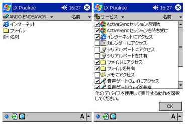 これらのプロファイルを利用してできることには、「指定したフォルダでのファイル共有」「名刺の送受信(“連絡先”に反映)」「ワイヤレスインターネット接続」「シリアルポートエミュレーション」「ヘッドセットの利用」「カレンダー/メモ/電子メールの送受信」などがある。 ヘッドセットのサポートは珍しいが、現時点ではBluetoothヘッドセットがほとんど入手できないため、あまり利用価値がない。もしちゃんと利用できれば、ワイヤレス音楽プレイヤーとして面白いだろう。ただし、モノラルだが……。 こうしたことを考えると、Pocket LOOXのBluetooth機能の利用法として、現時点で実用的なのは、Bluetooth対応の携帯電話やPHSを利用したワイヤレスインターネット接続だろう。NTTドコモのPHS「パルディオ633S」やauの「C413S」などのBluetooth対応端末が利用できる。 また、PCがBluetoothを装備していれば、ワイヤレスでファイル交換やActive Syncを行うことも可能だ。ただし本製品ではPANプロファイルを利用してActive Syncを実行する。このため、PC側のBluetoothもこれに対応している必要がある。 ところが市販のBluetoothアダプタは、まだほとんどが未対応だ。現時点でPCと本製品をBluetoothで接続したいなら、富士通が販売するBluetoothアダプタを購入するのが一番間違いがないだろう。 なお、Bluetoothの各機能は「LX Plugfree」というソフトで一括管理する。ファイル共有で共有フォルダを設定し、パスワードで、「読み書き可能」にするか「読み出しのみ」にするかといったことも管理できる。