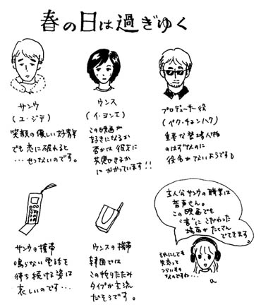 この映画のように、恋の始まりに携帯電話はかかせないものになっています。携帯電話を使ってアプローチすることで、進展していく関係は日本も韓国も同じようです。そんなどこにでもありそうな携帯電話での会話や、鳴らない携帯を見つめる眼差しを映した「春の日は過ぎゆく」を見ると、日本と恋の形も似ている韓国に親近感が湧いて来ます。