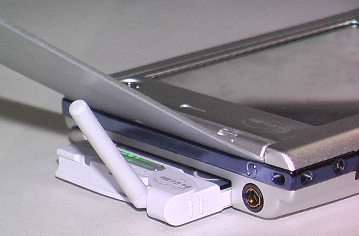 このカバーは上部のCFスロットと干渉しないように150°程度しか開かないようになっており、通信カードを挿したままでもカバーを開いて利用できる。またこのカバーは150°以上開くと簡単に外れるようになっている。