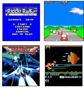 ![]() (C) KONAMI (C) KMO 504iシリーズの大容量を活かしたハイクオリティなゲームアプリを用意した。まずシューティングゲーム「沙羅曼蛇」「グラディウス」、RPG「モンスターゲート」、ラリーゲーム「利ドルラリー」を配信する。また「ときめきメモリアル」「幻想水滸伝」「pop'n music」シリーズなどコナミの人気キャラが登場する待ち受けアプリも配信する。