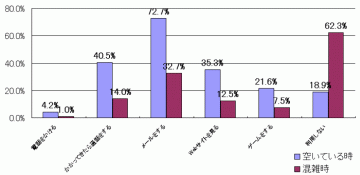 電車やバス内での携帯利用は、8割がマナーモードにしているが、電源を切っている人はほとんどいない──。サーベイリサーチセンターが携帯電話ユーザーに行った調査でこんな結果が出た。 調査によると、車内でマナーモードに設定しているのは混雑時で80%、空いている時で83.5%。電源を切っている人は空いている時で3.9%、混雑時で11.4%と割合が低く、着信音が鳴る状態のままの人も1割前後見受けられた。 では、電話がかかってきたときにどうするかというと、空いている時で4割が「通話をする」とし、メールの利用に関しては7割が「利用する」と答えている。混雑時は利用率が下がるが、車内でも携帯を利用している実態が明らかになった。 こんな実情を反映してか、「電源オフ、通話不可」などの携帯電話禁止車両においても、「完全に守っている」人は25.4%、「たまに守っていないことがある」人が50.2%に達した。