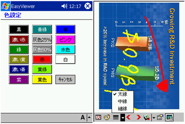 プレゼンテーションには、Pocket PC側にある画像ビューワソフト「EasyViewer」を使う。JPEGファイルが保存されているフォルダを開き、[ツール]メニューの[プレゼンテーション]を選択すると、自動的にEasyViewerがプレゼンテーションモードになり、外部ディスプレイにスライド画像が表示される。もし、Pocket PCの画面上でスライド画像が横向き(ランドスケープ)に表示されている場合は、自動的に縦向きに修正されてディスプレイに表示される。 スライド画像の移動は、Pocket PCの本体ボタンもしくはPocket PCの画面上に表示されるツールバーのボタンを使って行う。前表示、次表示のほかに、リストから直接指定する方法が用意されている。 また、Pocket PCのスタイラスペンを使って、スライド画像に線や文字をリアルタイムに手書き入力することが可能だ。プレゼン中に、太さや色を変えながら、注目させたい箇所に線や印を付けたり、コメントを書き加えたりといったことができる。