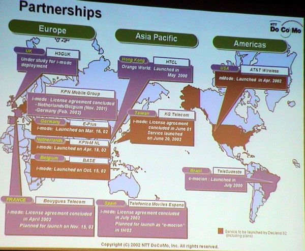 ![]() 各国で始まりつつあるiモードサービスでは、(一応)業界標準のWAP(2.0)ではなく、iモードの記述言語「cHTML」が利用される さらには、「M&Aという手法を使って世界中を覆い、デファクトスタンダードを固めようとしている会社もある」と話すなど、穏やかな口調ながら、ライバル企業に向けて痛烈な皮肉も放って見せた。 GSMでは成功した標準化だが、モバイルインターネットサービスではどうか。旗振り役のNokiaとは異なり、各通信キャリアの本音は少々複雑なようだ。