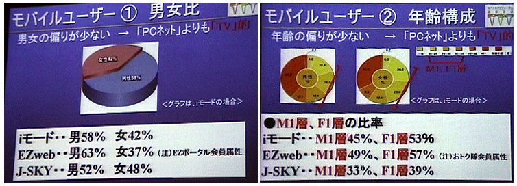 現在、ブラウザフォンの契約数は5777万で「15歳−65歳のうち4人に3人が利用している」と藤田氏。男女比を見ると、iモードの場合で男性58%、女性42%とほぼ同比率。消費活動が盛んなM1、F1層(20歳−34歳までの層。M1が男性、F1が女性)を見ると、M1層の割合が45%、F1層が53%だ。40代以上の割合も増える傾向にあることから藤田氏は「モバイルユーザーのプロファイルはPCよりもテレビ的」と分析する。