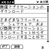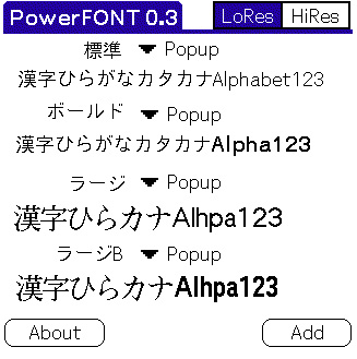 ![]() PowerFONTを利用すれば任意のフォントを割り当てられる J-Suites for Clie は、ハイレゾ画面を装備した英語版CLIEで日本語を扱うためのソフト。日本語フォントを表示する「PowerFONT」、日本語の文字列を正しく扱うための「J-OS Text Hack」、文字入力を行う「J-OS IME」、ローカライザーを利用可能にする「Localize Hack」などのソフトで構成されている。動作環境は、ハイレゾ画面を備え、Palm OS3.5−4.1英語版を搭載したCLIE(CLIE NXシリーズは未対応)。