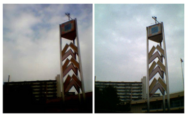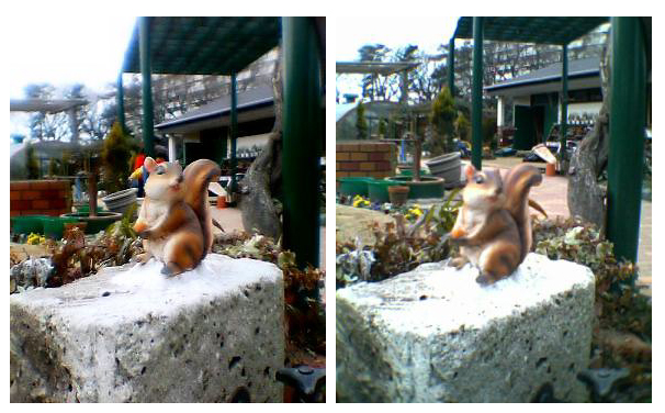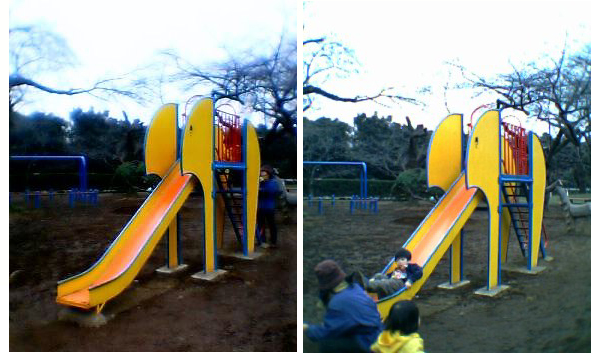 今回も残念ながら曇天下だったが、こればかりは仕方がないので、3パターン用意してみた。いずれもiショットLで撮影したものである。 まずはリスの置きもの。「P251iS」は、遠くのディテールは怪しげだが、彩度が非常に高くて色はあざやかである。「D251iS」は、近距離がボケる傾向にある。 携帯電話のカメラはどれも「固定フォーカス」式で、近距離から遠距離まで全体にピントが合うようになっている(パンフォーカスという)。カメラの特性上、受光部が非常に小さいので本格的なデジカメやフィルムカメラよりピントの合う範囲が非常に広く、固定フォーカスでも近くから遠くまでピントが合うのだ。 しかし「D251iS」は、ほかのカメラ付き携帯電話に比べて、近距離の被写体がボケる傾向にあるようだ。近いものを撮るときは気を付けた方がいいかもしれない。発色はこちらも色鮮やかでなかなかきれいである。 続いて象のすべり台。暗い色の地面と明るい色の空が同時にフレームに入るという構図だが、どちらもきちんと色が出ていて好感が持てる。ただ色のバランスは「P251iS」のほうがいい。地面の色を見ると分かるが、「P251iS」はちゃんと「土の色」をしているのに対し、「D251iS」はやや青っぽい。 最後は時計塔。撮影条件は同じだが、「P251iS」の方はちょっと露出アンダーだけど雲の間のわずかな青を捉えて空っぽい色に仕上げている。D251iSはそれに比べると素直な発色で、露出も適正。 どちらも屋外の撮影はなかなかのものだ。