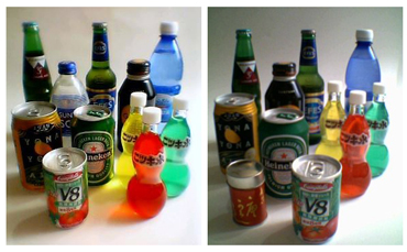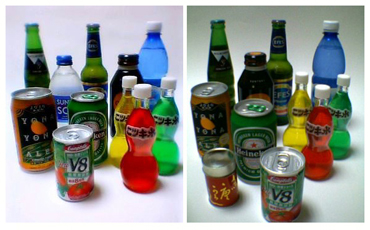 まずは蛍光灯の下で瓶や缶を並べて撮ってみた。こちらは両者で撮影日が違うので、微妙に並んでいる瓶や缶が異なるが、照明の条件は同じなのでそのまま比べてもらって構わない。 「P251iS」は、もうわざとらしいほどきれいに撮れている。背景が白いと露出アンダーになりがちなのだが、そうはならず非常に色鮮やかである。携帯電話のカメラは、このくらいわざとらしくていいと思う。正確な写真より気持ちいい写真が求められるのだ。「D251iS」は極めて一般的な写りでちょっと露出アンダー気味であるが色のバランスは悪くない。